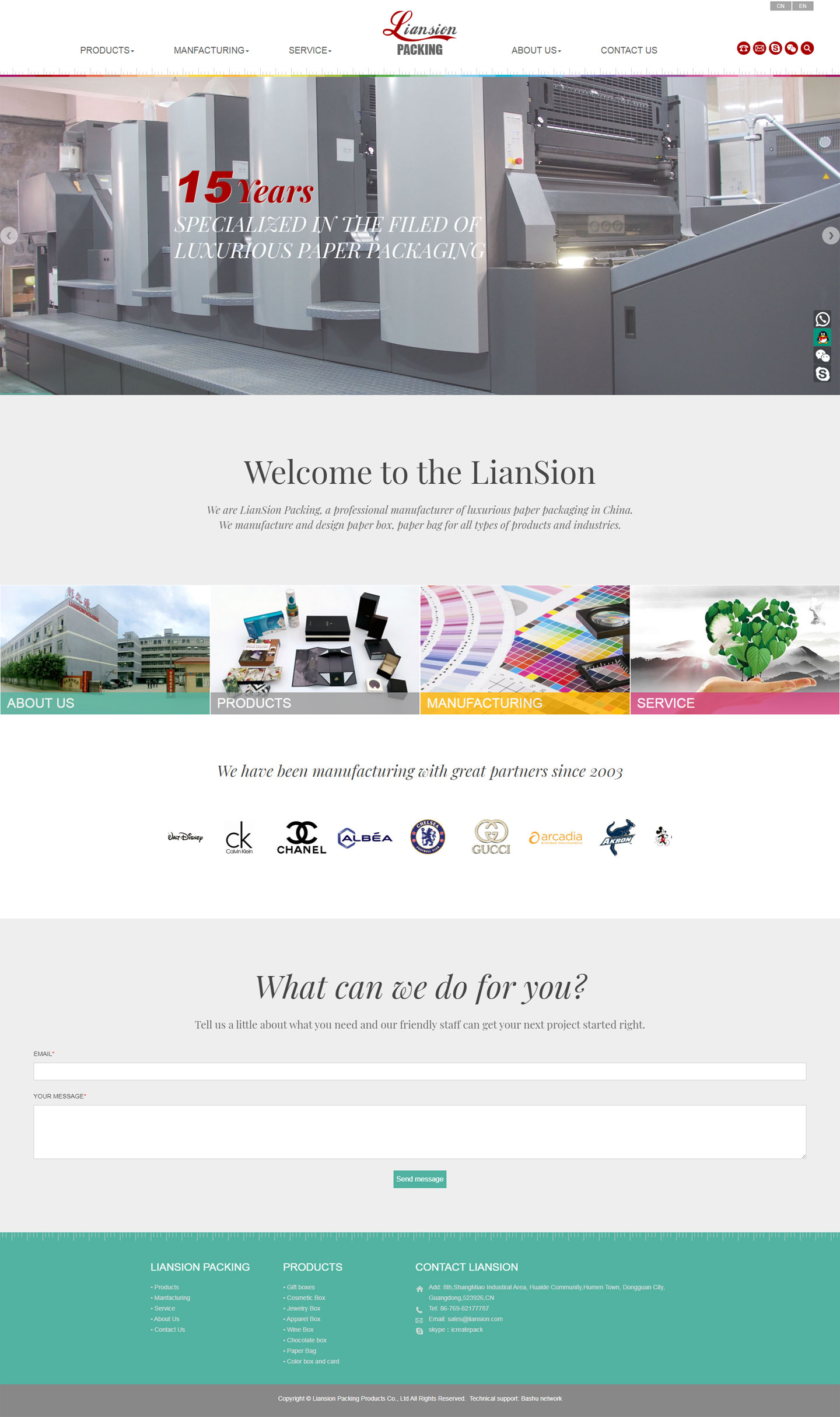 公司拥有完善的印刷印后设备,生产产品包括精品手工盒,彩盒,纸袋以及其他印刷类产品,我们为客户提供完善的印刷解决方案。