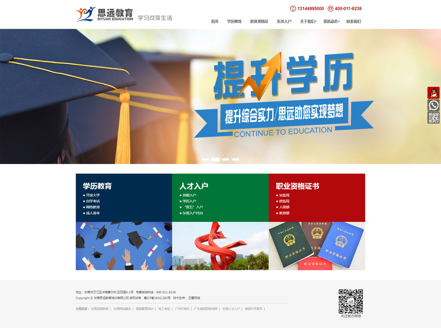 东莞市思远教育培训有限公司成立于2012年,旨在通过国际领先的经验理念,专业打造一个以地级市为中心的一站式教育信息顾问服务平台。公司官网由巴蜀网络承接建设,采用HTML+CSS3响应式建站技术,按所属领域建立不同分站,专业关键词分开优化,以达到更好网站优化效果!