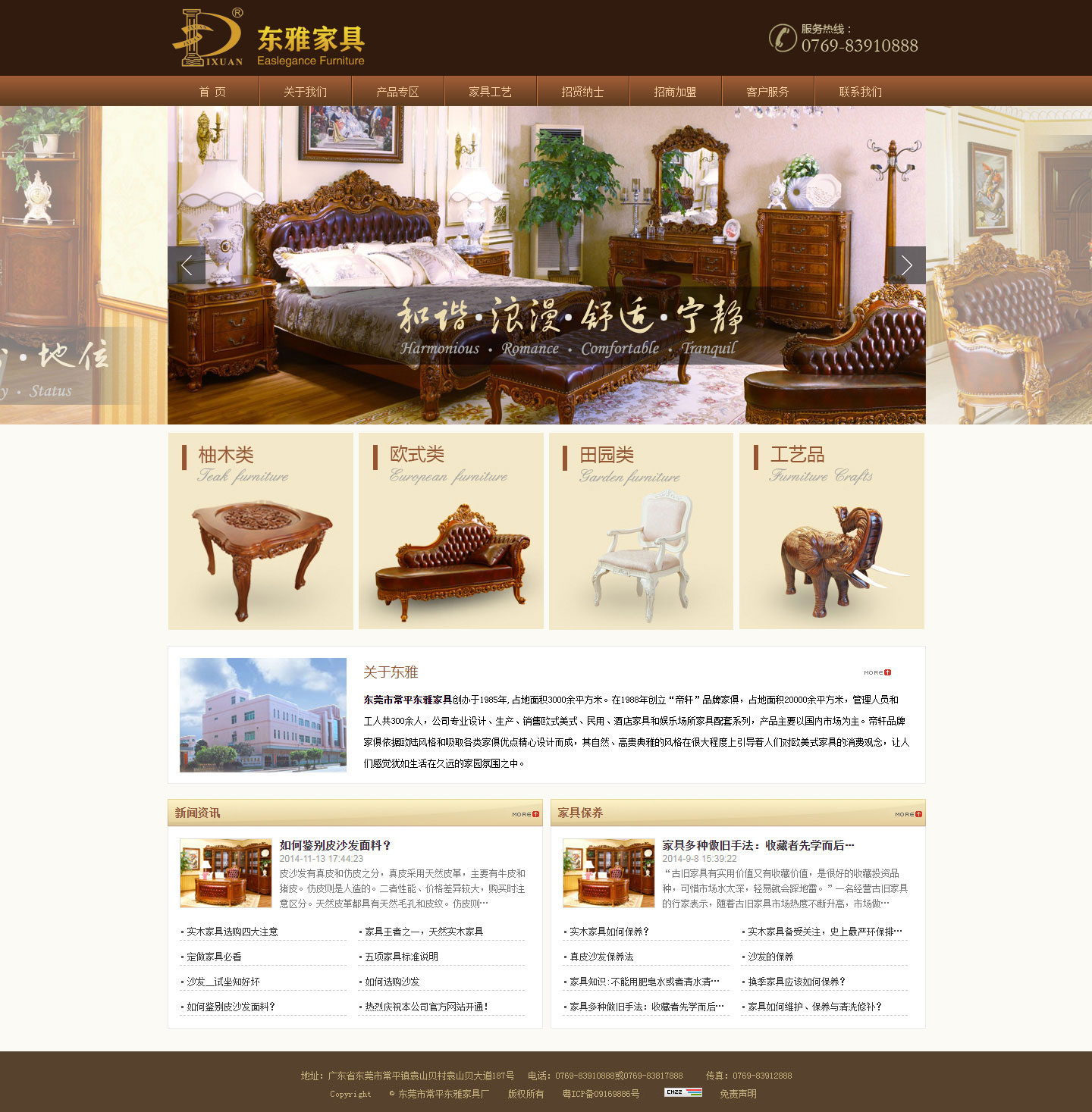 东莞市常平东雅家具有限公司创办于1985年,占地面积3000余平方米。在1988年创立“帝轩”品牌家俱,占地面积20000余平方米,管理人员和工人共300余人,公司专业设计、生产、销售欧式美式、民用、酒店家具和娱乐场所家具配套系列,产品主要以国内市场为主。
