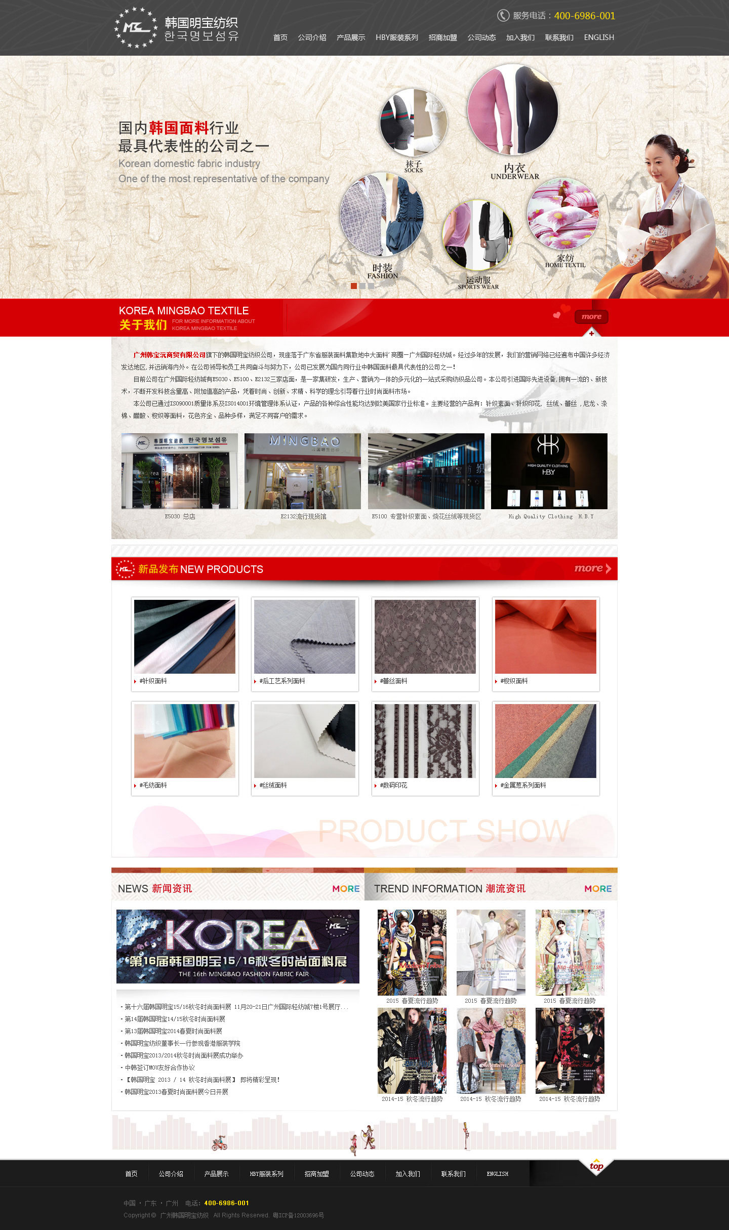 广州韩宝沅商贸有限公司旗下的韩国明宝纺织公司,现座落于广东省服装面料集散地中大面料'商圈—广州国际轻纺城。经过多年的发展,我们的营销网络已经遍布中国许多经济发达地区,并远销海内外。