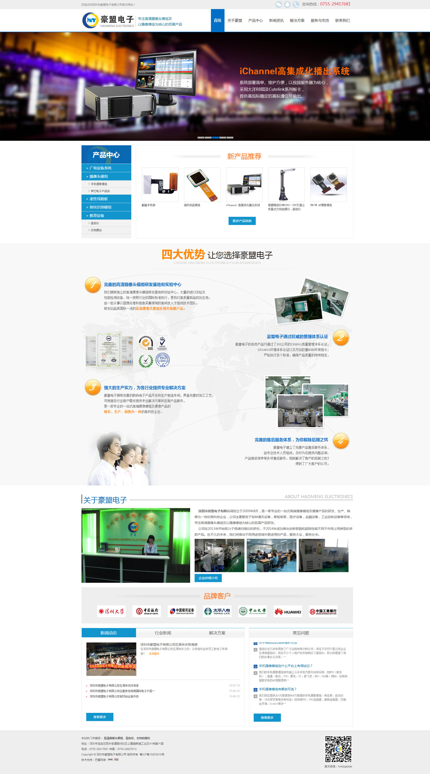 深圳市豪盟电子有限公司创立于2009年8月,是一家专业的一站式高端摄像模组及摄像产品的研发、生产、销售为一体的高科技企业,公司主要服务于各种通讯设备,智能家居,医疗设备,金融设备,工业控制设备等领域,专注高清摄像头模组及以摄像模组为核心的拓展产品研发。