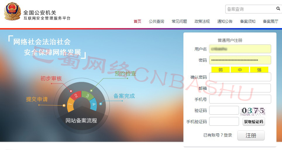 第一步:进入网址http://www.beian.gov.cn/ 注册账号并登陆(注册时需要手机验证码,有效时间5分钟)