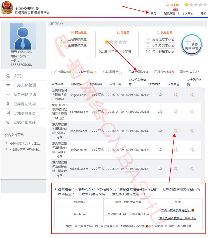 备注:此备案在主体审核、及网站审核的过程中,会有几次短信提醒,以最后一次收到网站公安机关备案号(例如:粤公网安备 44190002002133号)为准,标志此项工作完成,并尽快将相应代码加入网站。