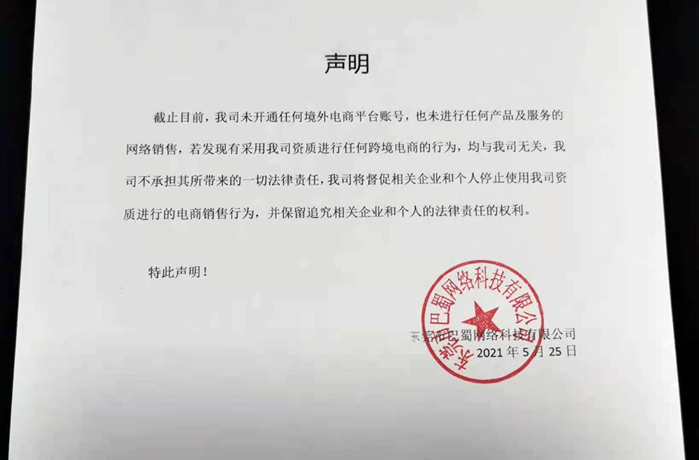 截止目前,我司未开通任何境外电商平台账号,也未进行任何产品及服务的网络销售,若发现有采用我司资质进行任何跨境电商的行为,均与我司无关,我司不承担其所带来的一切法律责任,我司将督促相关企业和个人停止使用我司资质进行的电商销售行为,并保留追究相关企业和个人的法律责任的权利。